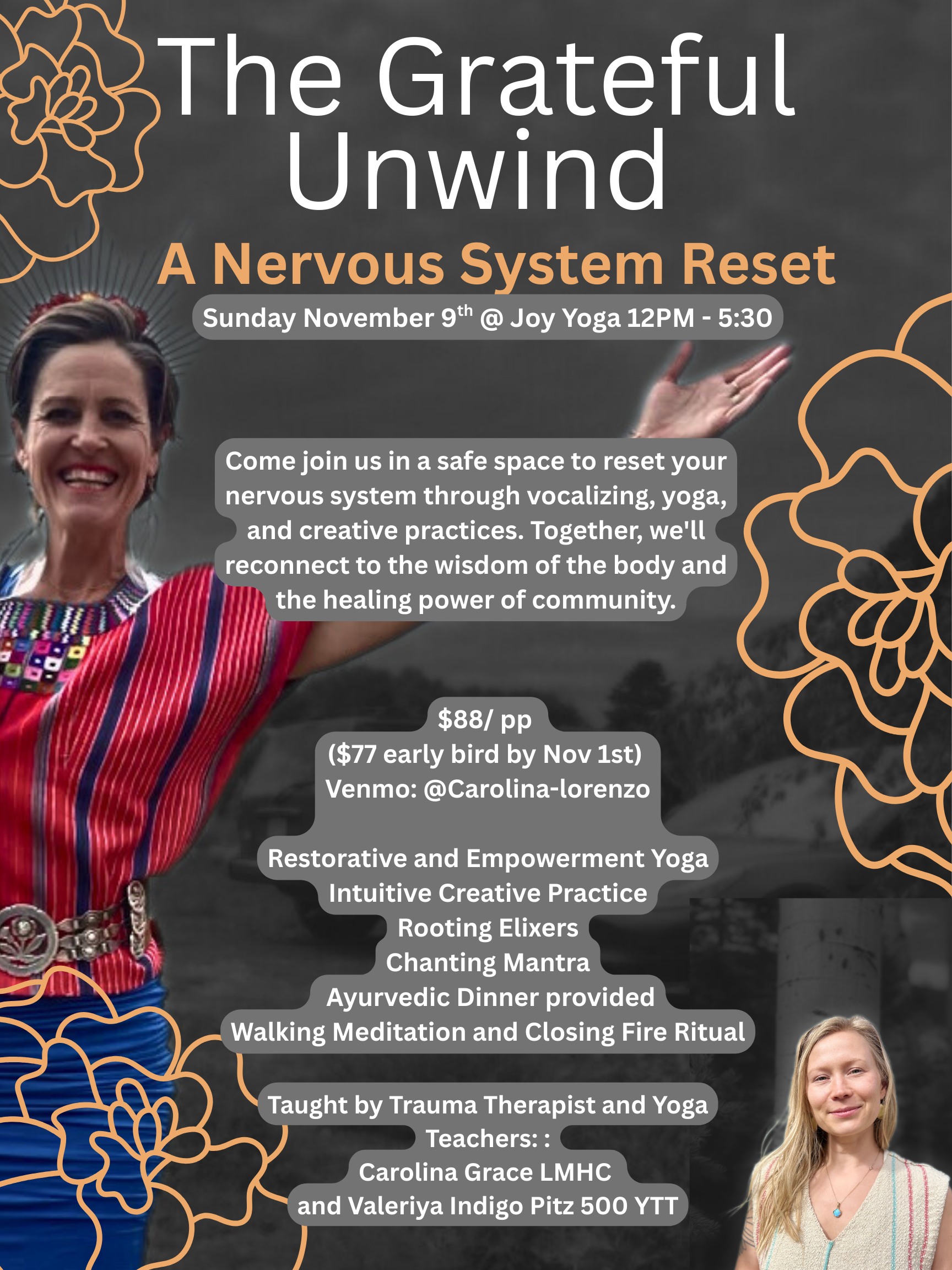 Led by yoga teachers Jayme Davis, author of Joy Compass, & Carolina Grace, MA, LMHC.